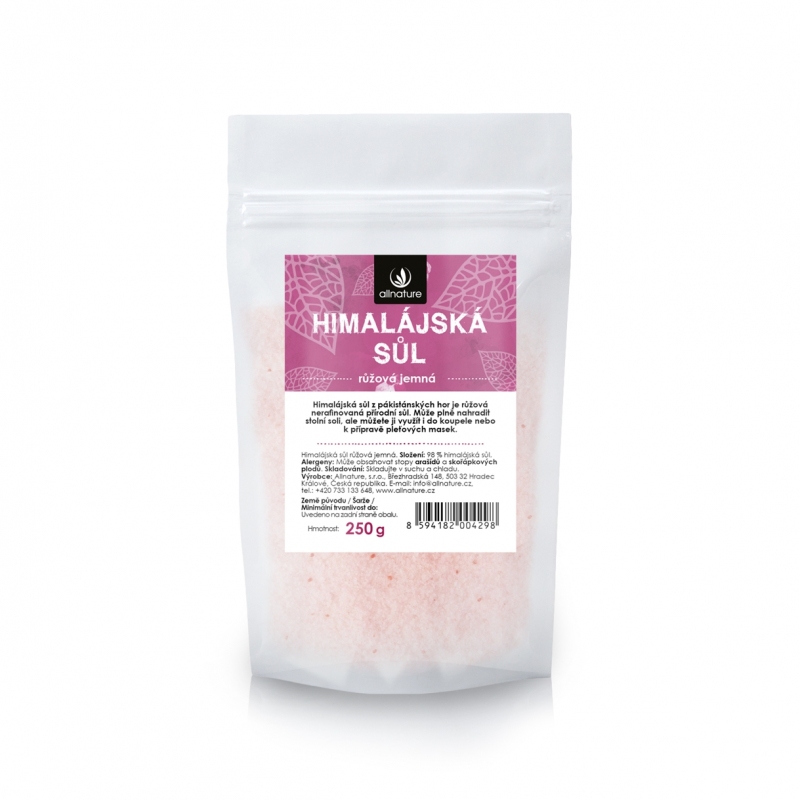 Jemně mletá růžová himalájská sůl z pákistánských hor. Není rafinovaná a neobsahuje žádné uměle přidané látky. Růžové zbarvení je způsobeno obsahem čistého železa. Lze použít i do koupele nebo k přípravě domácích peelingů. Kromě železa je himalájská sůl zdrojem vitamínů, minerálních látek jako vápník, hořčík či draslík.