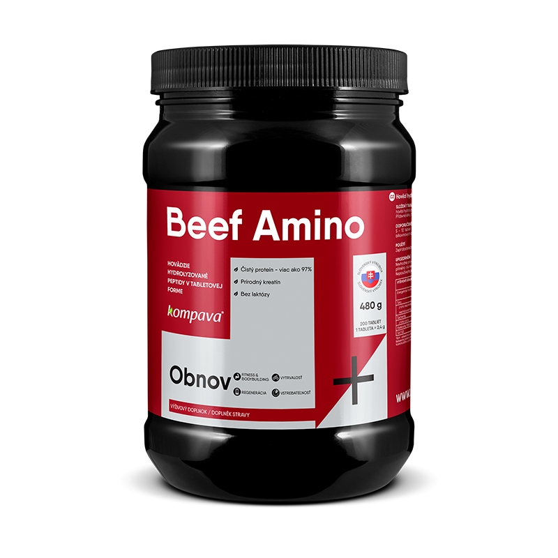 Beef Amino je zdrojom širokého spektra aminokyseliny. Hovädzie peptidy sa vyznačujú komplexným spektrom esenciálnych a neesenciálnych aminokyselín. Beef Amino obsahuje v optimálnom pomere aminokyseliny arginín, glycín, prolín a hydroxyprolín. Vytvára optimálne anabolické prostredie pre rast svalov. Neobsahuje tuk, cholesterol, laktózu, arómy, farbivá ani hydrolyzát želatiny. Je vhodný pre ľudí s laktózovou intoleranciou. Má vysoký obsah prírodného kreatínu, železa, zinku, fosforu a vitamínov B, E a A.