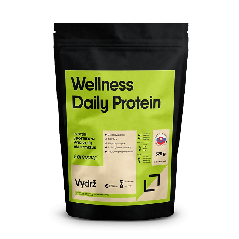 Wellness Deily Protein je navrhnutý tak, aby telu dopĺňal všetky potrebné látky s dôrazom na jeho maximálnu efektívnosť a využiteľnosť v organizme. Pomáha dosiahnuť stanovené ciele vyformovanej postavy a zdravého životného štýlu. Zabezpečuje dostatočný a dlhodobý prísun všetkých potrebných látok pre správne fungovanie zaťaženého organizmu. Urýchľuje proces regenerácie organizmu a pomáha udržať optimálnu telesnú hmotnosť. Vďaka svojmu zloženiu a vitamínom C a E, minerálu zinku podporuje normálnu funkciu imunitného systému. Výnimočnou súčasťou zloženia sú MCT tuky, ktoré sú ľahko stráviteľné a používajú sa ako rýchly zdroj energie pre metabolizmus svalov.